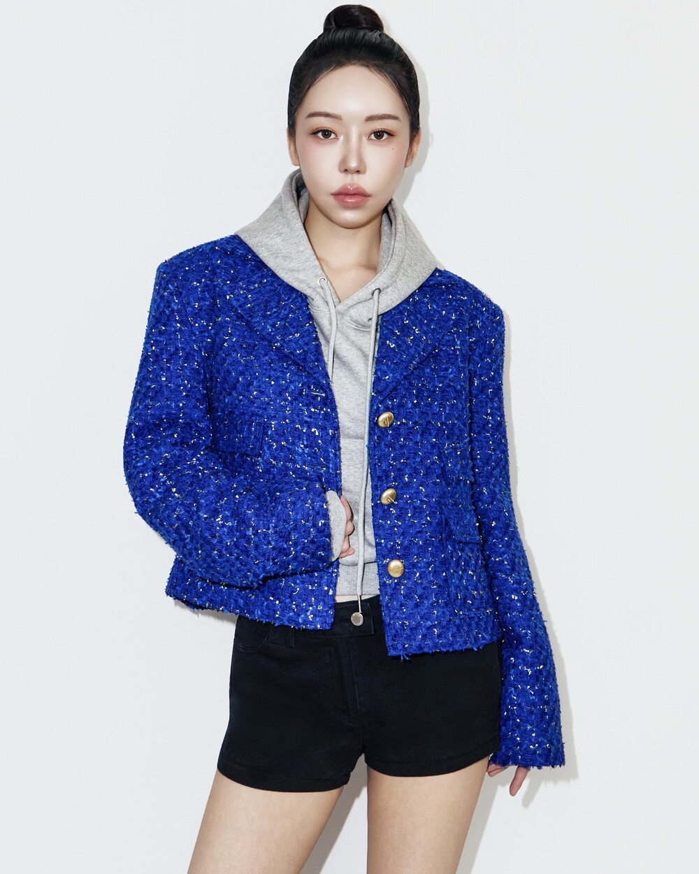 앞면에 골드 컬러 단추가 더해지며